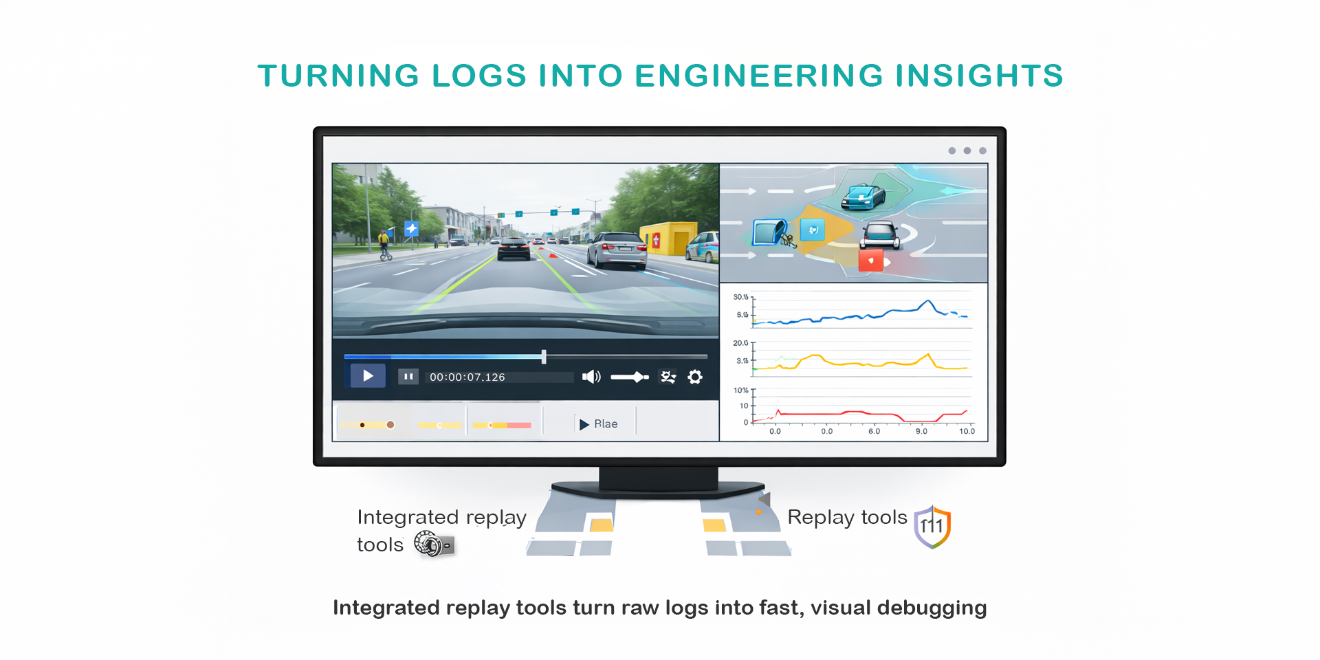 When something goes wrong, synchronized sensor and vehicle logs let engineers replay exactly what the system saw, decided, and did, frame by frame.